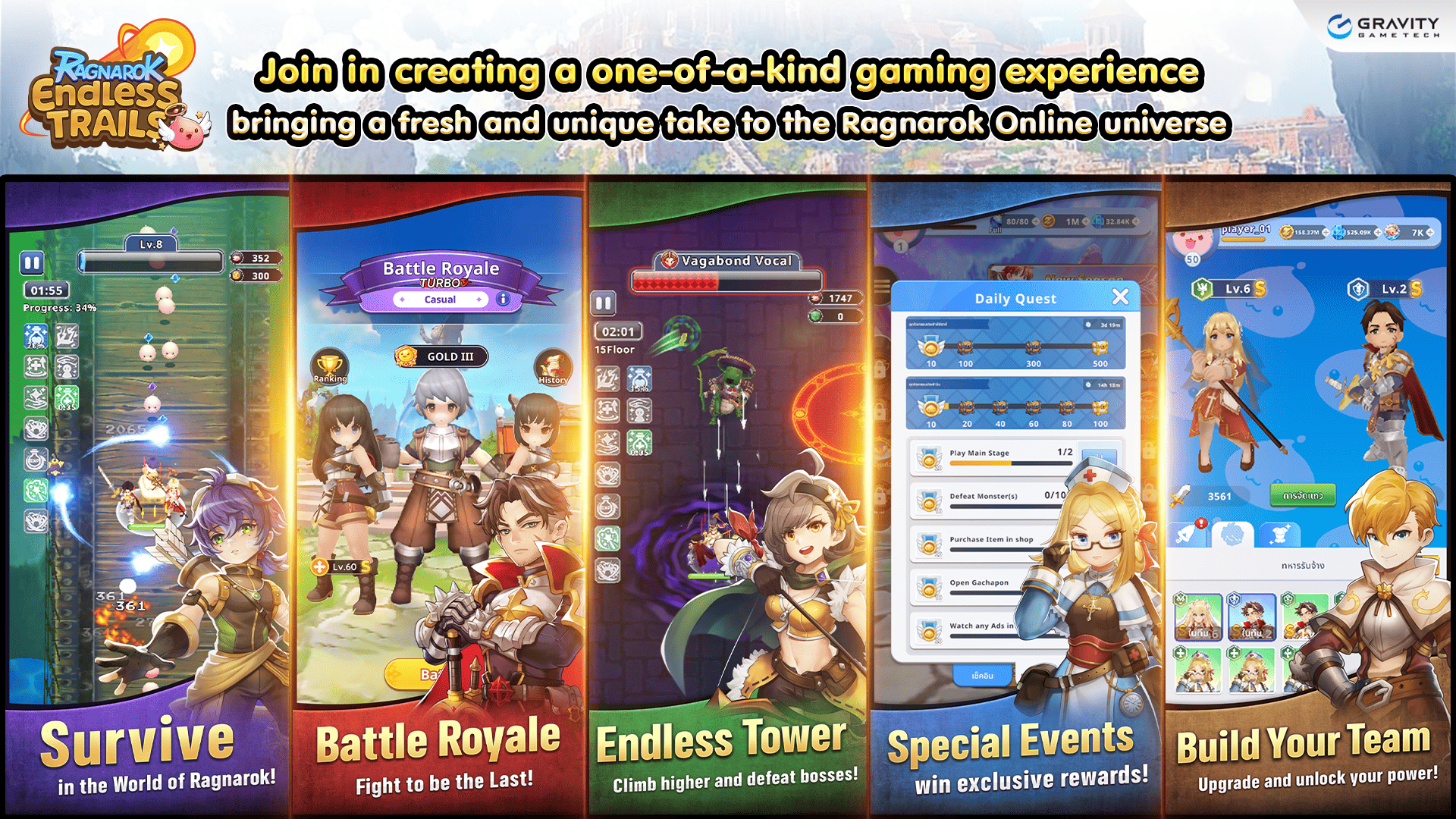 “Ragnarok Endless Trails,” the newest mobile game from the Ragnarok Online universe, developed and created by a Thai team, is a vertical mobile game in a Hybrid Roguelike style. It combines Roguelike PvE gameplay with real-time PvP Battle Royale combat.